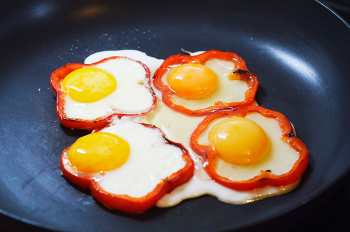 Add the eggs and salt inside the pepper slices. Do not worry if the eggs erupt from the peppers, we will cut the exceeding part.